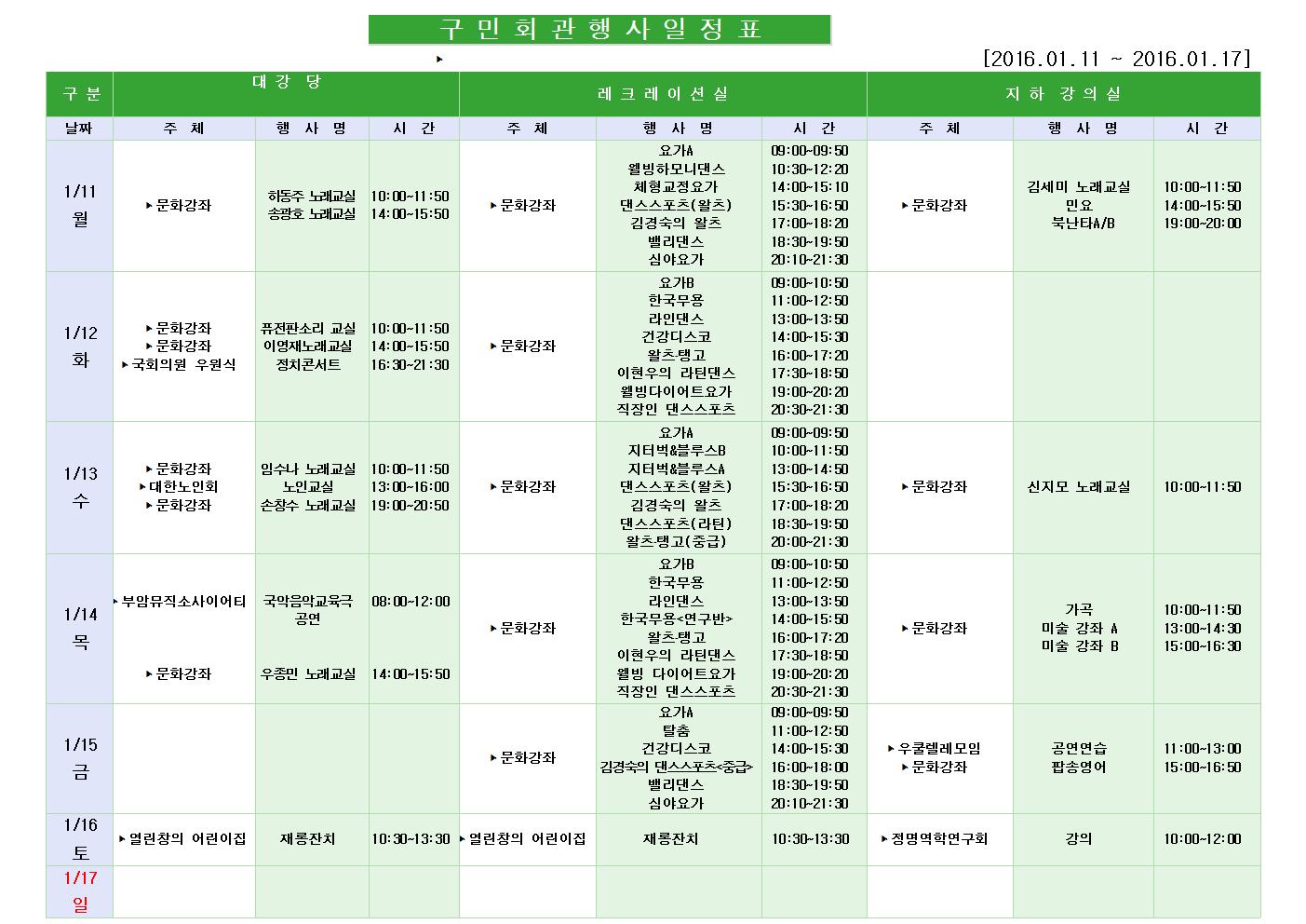 1월 11일 월요일부터 1월 17일 일요일까지의 구민회관 행사 일정을 공지해드리오니