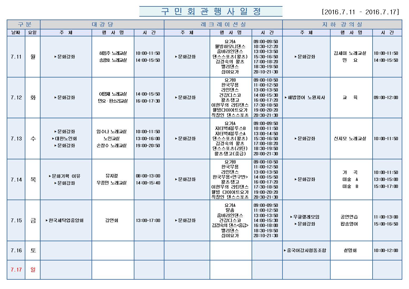 7월11일(월)부터 7월 17일 (일)까지의 구민회관 행사 일정을 공지해드리오니
