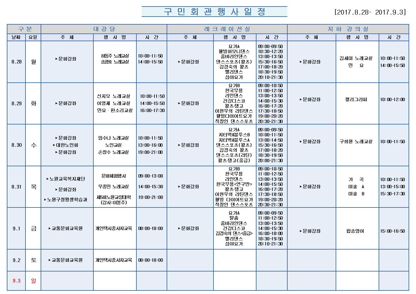 8월28일(월)부터 9월3일 (일)까지의 구민회관 행사 일정을 공지해드리오니