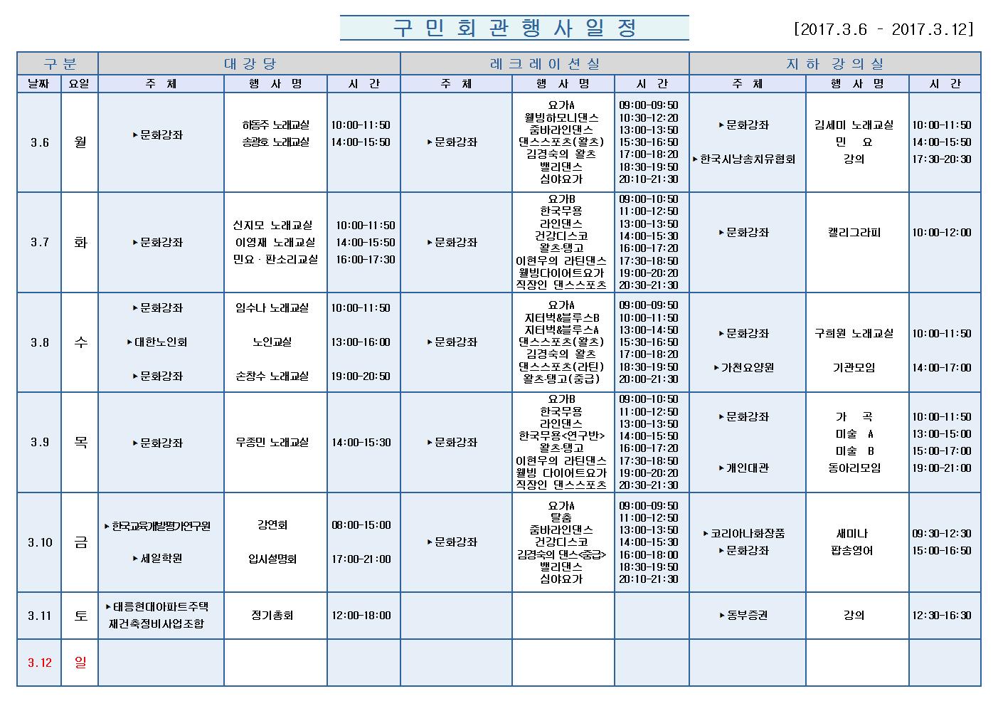 3월6일(월)부터 3월 12일 (일)까지의 구민회관 행사 일정을 공지해드리오니
